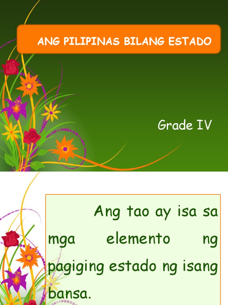 Ang Pilipinas naman ay masasabing isang bansa dahil ang amat na elemento ng isang bansa ay makikita na sa Pilipinas. Ang isang estado ay nagtataglay ng apat na mahahalagang elemento. Pagganyak MOTIVATION Ano ang pinakamahalagang sangkap ng malayang bansa.