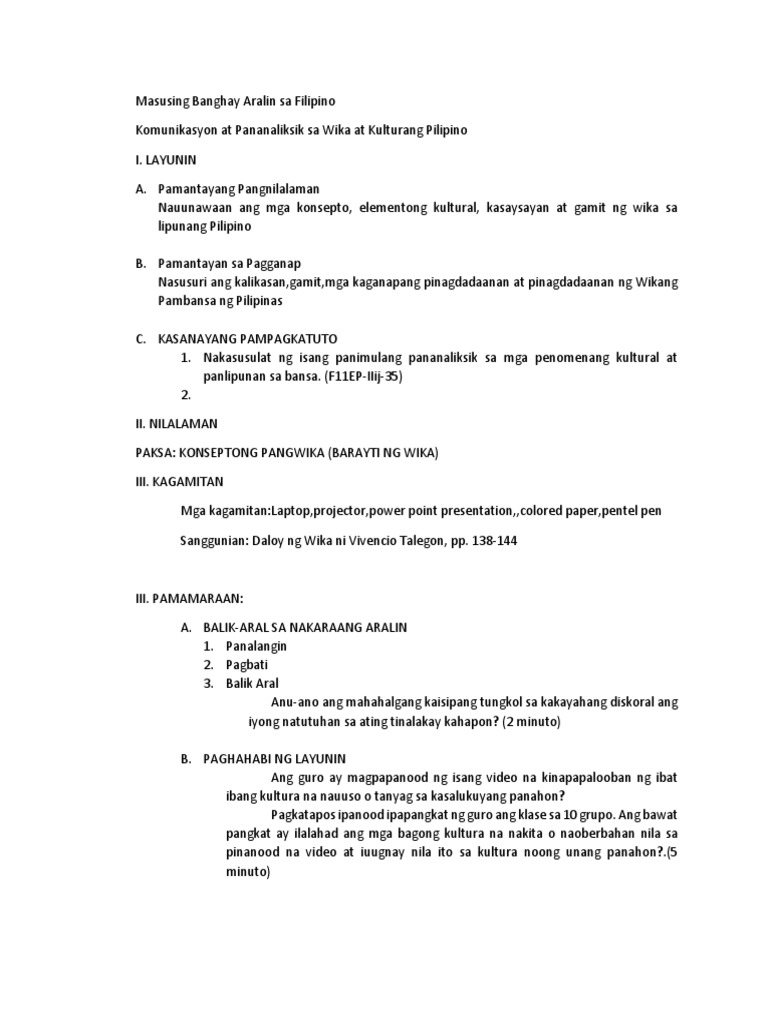 Nakasusulat ng isang panimulang pananaliksik sa mga penomenang kultural at panlipunan sa bansa. Nauunawaan nang may masusing pagsasaalang-alang ang mga lingguwistiko at kultural na katangian at pagkakaiba-iba sa lipunang Pilipino at mga sitwasyon ng paggamit ng wika dito Pamantayan sa PagganapNakasusulat ng isang panimulang pananaliksik sa mga penomenang kultural at panlipunan sa bansa Panitikang Kontemporaryo. Napapanahong sanaysay talumpati panitikang popular awitin komiks ibat ibang paraan ng komunikasyon sa social media Gramatika.