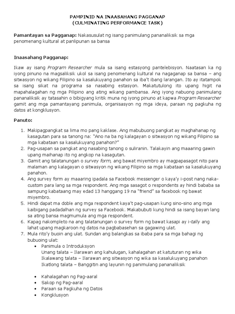 Gumamit ka ng angkop na mga salita at pangungusap upang mapag-ugnay-ugnay mo ang mga ideya sa iyong susulatin. Pananaliksik sa filipino 11 final 1. MEDILO Asignaturang Guro-Filipino Holy Rosary Academy of Hinunagan Inc Hinunangan Southern Leyte _____ Bilang Bahagi ng mga Kakailanganin sa Asignaturang Filipino.