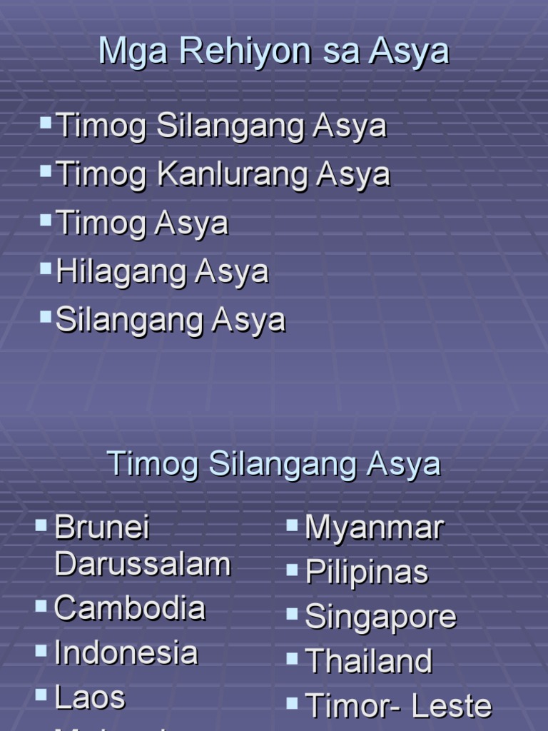 Sa videong ito ay ituturo sa ating ang mga rehiyon sa asya at ang katangian ng bawat rehiyon. PERFECTO Angeline - MenguitoIntroduksyonAng mga Asyano ay kilala bilang ang mga taong naninirahan sa kontinenteng Asya. BANSA NG KANLURANG ASYA Sa paksang ito alamin at tuklasin natin ang ibat ibang mga bansa ng Kanlurang Asya at ang paglalarawan ng bawat isa Ang Asya ay nahahati sa limang rehiyon.