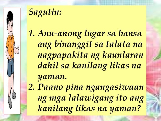 Ano-ano ang maaaring mangyari kapag hindi natin sinunod ang mga sinasabi sa tula c. Bilang batang Pilipino kailangan ang iyong tulong upang mapagyaman at masagip ang mga likas na yaman ng bansang Pilipinas GAWAIN A. Sagutin ang sumusunod na mga tanong.