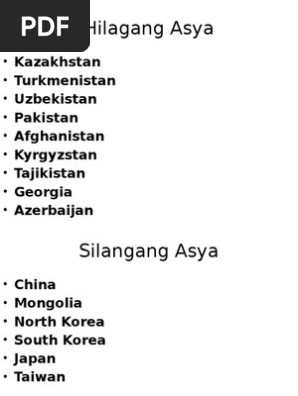Click to expand document information. PAGKAKAHATING PANGREHIYON NG ASYA MGA REHIYON NG ASYA. Asya - Wikipedia ang malayang ensiklopedya.