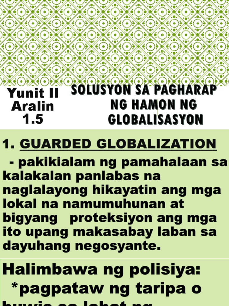 Take over of standards domestic firms 4International cooperation Guarded Globalization. Guarded Globalization Pakikialam ng pamahalaan sa kalakalang panlabas na naglalayong hikayatin ang mga lokal na namumuhunan at bigyang-proteksiyon ang mga ito upang makasabay sa kompetisyon laban sa malalaking dayuhang negosyante. Rise in monopoly 2Development of 3.