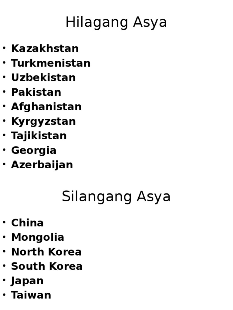 Limang bansa sa silangang asya. Ang Asya ay nahahati sa limang rehiyon. Ang kontinenteng Asya ay ang pinakamalaking kontinente sa buong mundo. BANSA NG TIMOG SILANGANG ASYA Sa paksang ito alamin natin ang ibat ibang mga bansa ng Timog Silangang Asya at ang paglalarawan nila.