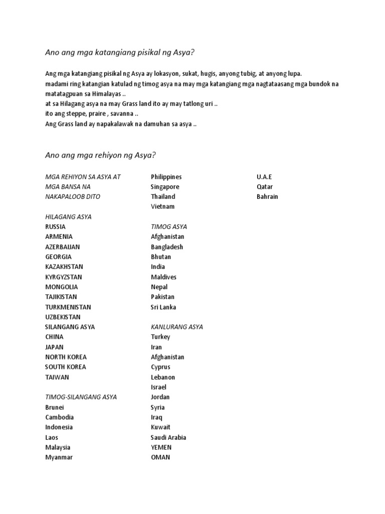 Nasusuri ang mga ambag ng sinaunang kabihasnan sa Kanlurang Asya. Ang kontinenteng Asya ay ang pinakamalaking kontinente sa buong mundo. United Arab Emirates 9.